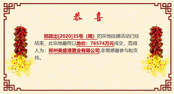 2020年5月20日,美盛以雷霆之勢連續摘得金水區核心版塊三宗地塊,短短三個多月,2020年9月4日,美盛地產集團金水區再摘新地——鄭政出〔2020〕35號(網)地塊,該地塊位于北三環路北、渠東路東,為陳砦城中村改造用地。